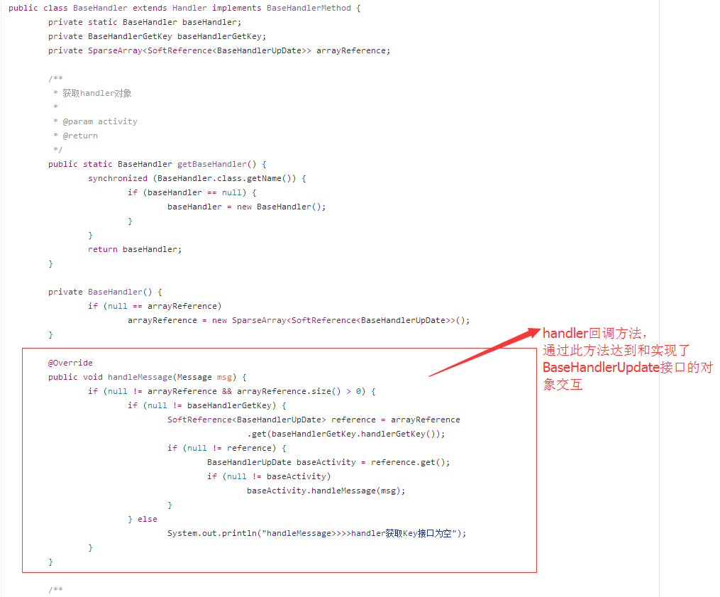 BaseHandler继承handler采取单例模式。然后在BaseHandler对象里面用稀疏数组SparseArray存储handler回调handleMessage方法里面要调用的对象,调用对象用SoftReference软引用做载体存储。BaseHandler类主要通过实现BaseHandlerMethod接口对SparseArray对象的增删查调等方面的操作