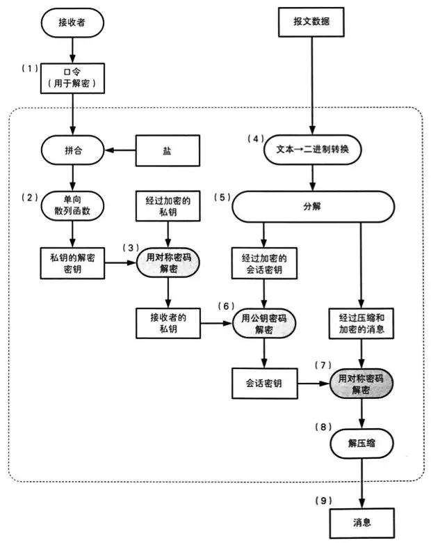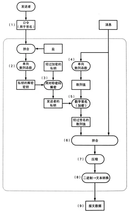 如何将密码和数字签名进行组合,下面两张图是整本书最复杂的,但它只不过是将之前讲解的内容组合起来了而已。