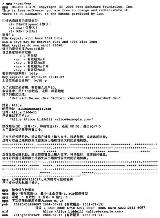 要在 PGP 中进行加密和数字签名,需要先生成自己的密钥对。下图展示了从命令行生成密钥的过程,其中,粗体为用户输入的内容: