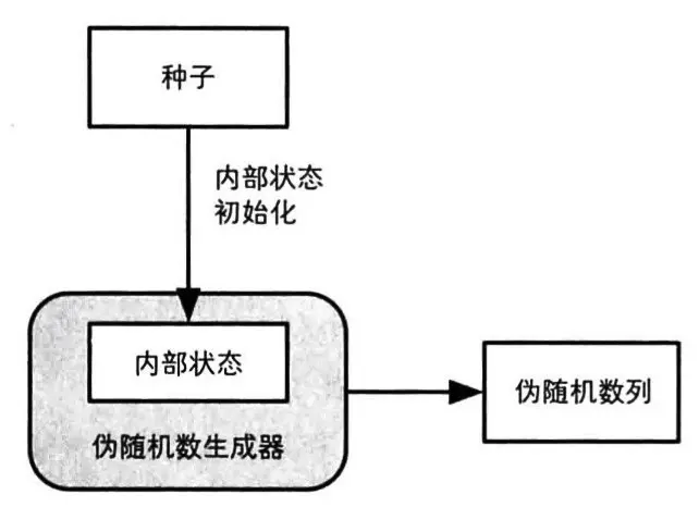 伪随机数生成器具有“内部状态”,并根据外部输入的“种子”来生成伪随机数列,如下图: