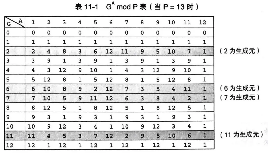 关于第1步提到的生成元是什么呢?先来看一张表,假设 P = 13: