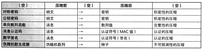 另外,所有密码技术其实也可以看成是一种“压缩技术”,如下表所示:
