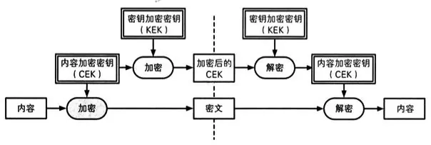 在对称密码中,加密和解密使用的是相同的共享密钥。而在公钥密码中,加密用的是公钥,解密用的则是私钥,相对应的公钥和私钥组为密钥对。消息认证码使用的也是共享密钥。而数字签名使用的和公钥密码一样是密钥对,用私钥签名,用公钥验证签名。混合密码系统中还使用了一次性密钥,称为会话密钥。而相对于每次通信都更换的会话密钥,一直被重复使用的密码则称为主密钥。用于加密内容的密钥称为CEK(Contents Encrypting Key,内容加密密钥);相对地,用于加密密钥的密钥则称为KEK(Key Encrypting Key,密钥加密密钥)。CEK 和 KEK 的用法可以如下图所示: