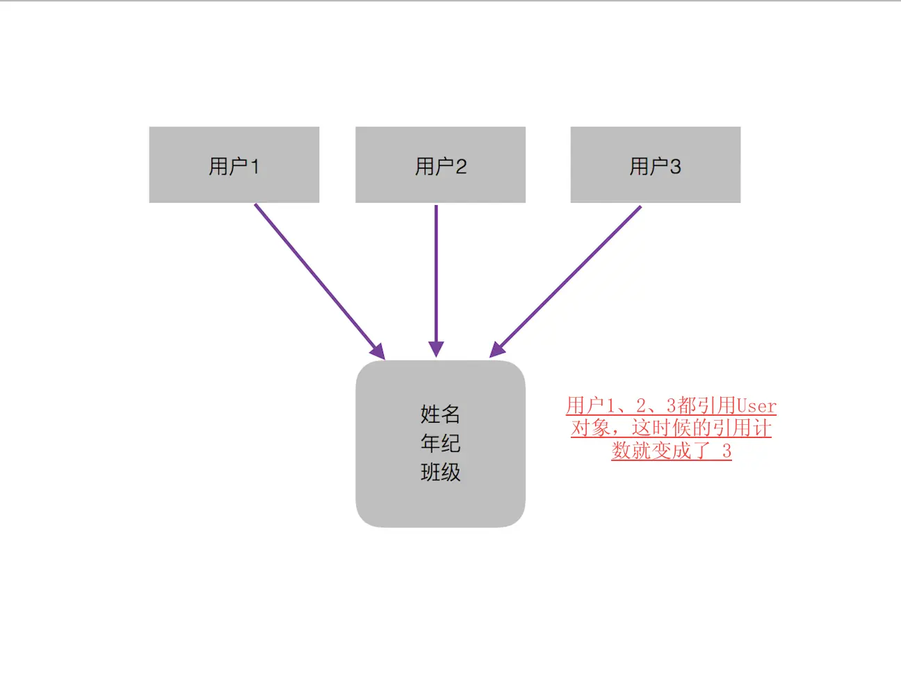 // 这时候被变量2 和变量3 都引用了,User对象的引用计数就变成了------ 3