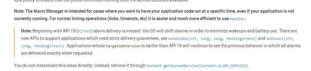 从API 19开始,AlarmManager的机制都是非准确传递,操作系统将会转换闹钟,来最小化唤醒和电池使用。