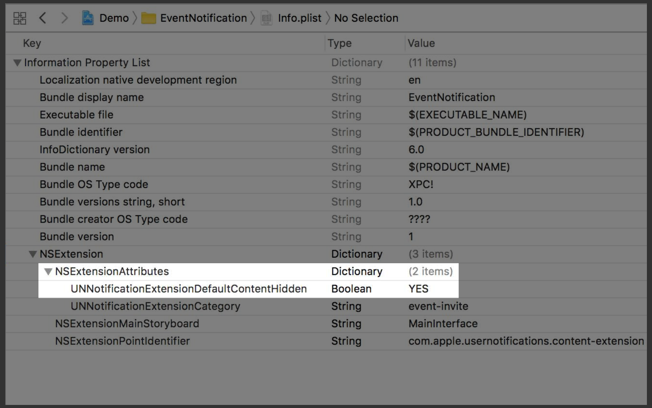 接下来,我们需要做的是,告诉iOS系统,推送送达之后,iOS系统如何找到你自定义的Notification content extension。