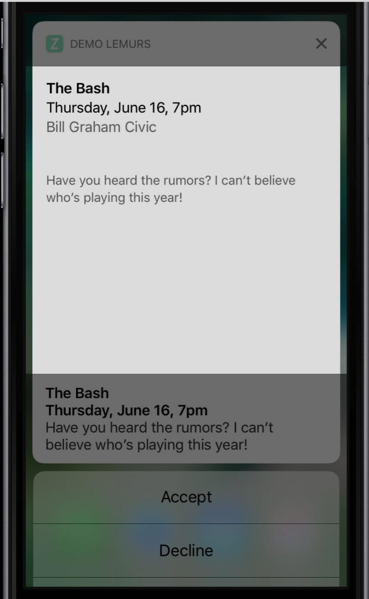 比如有个朋友在日历中给我了一个聚会的邀请,这个时候就来了推送,推送里面的内容就是包含了聚会的时间地点信息,推送下面有三个按钮,接受,谢绝。下面的例子都以此为例。
