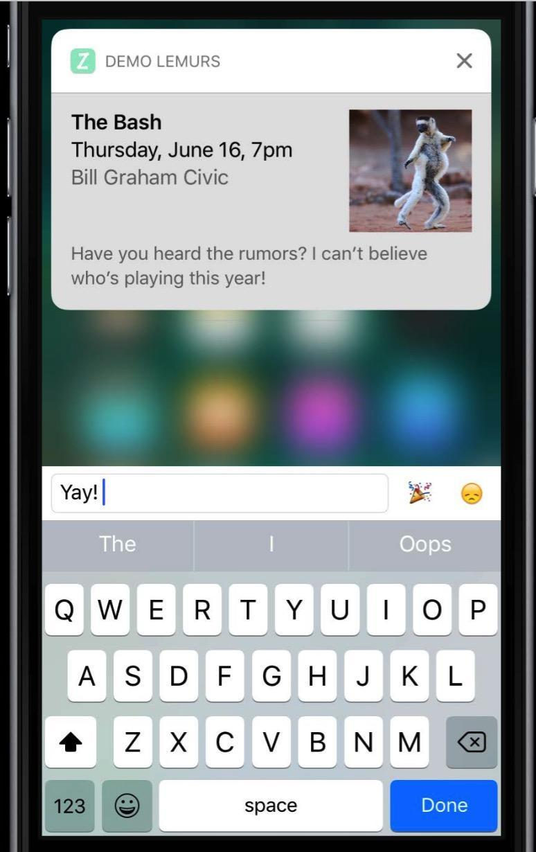 Notification content extension允许开发者加入自定义的界面,在这个界面里面,你可以绘制任何你想要的东西。但是有一个最重要的限制就是,这个自定义的界面没有交互。它们不能接受点击事件,用户并不能点击它们。但是推送通知还是可以继续与用户进行交互,因为用户可以使用notificaiton的actions。extension可以处理这些actions。