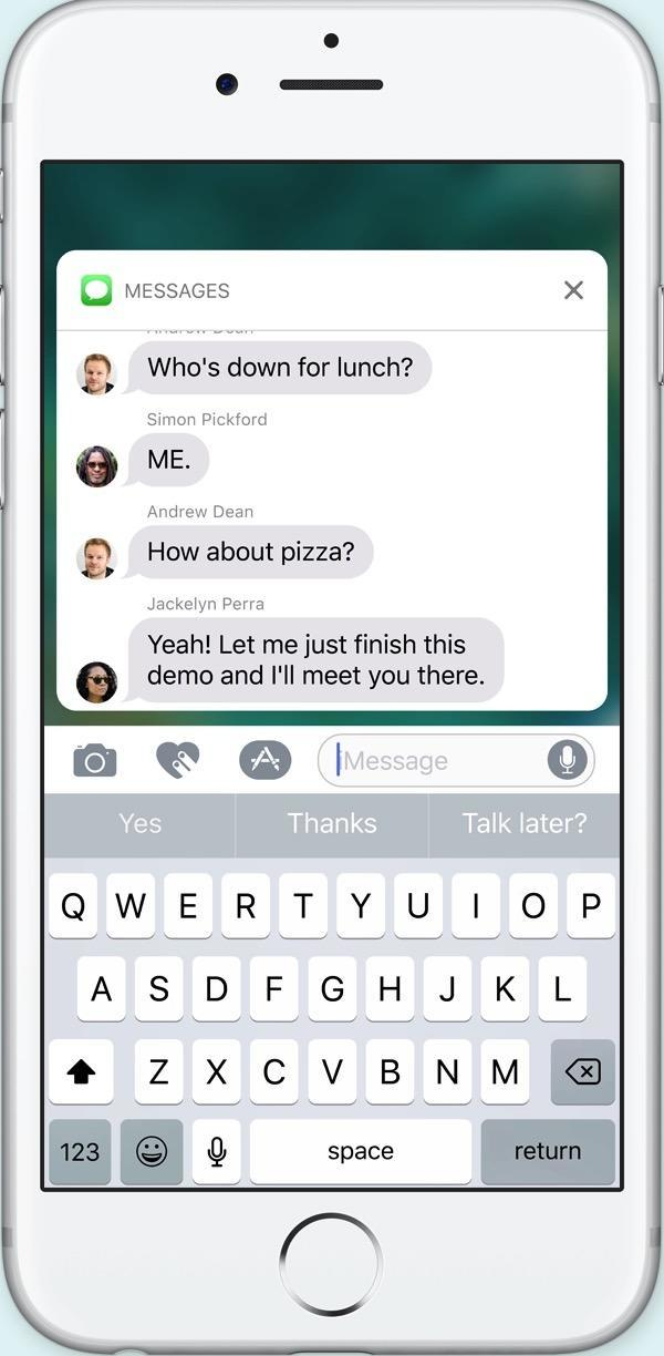 iOS 8 中iMessage支持了快速回复功能,但是你只能看见一条信息,并且你也只能回复一条信息。但是在iOS X中,你可以展开推送,这个时候你就可以看到整个对话的内容了。你可以等待你的朋友回复,你再回复他,并且可以回复很多条。