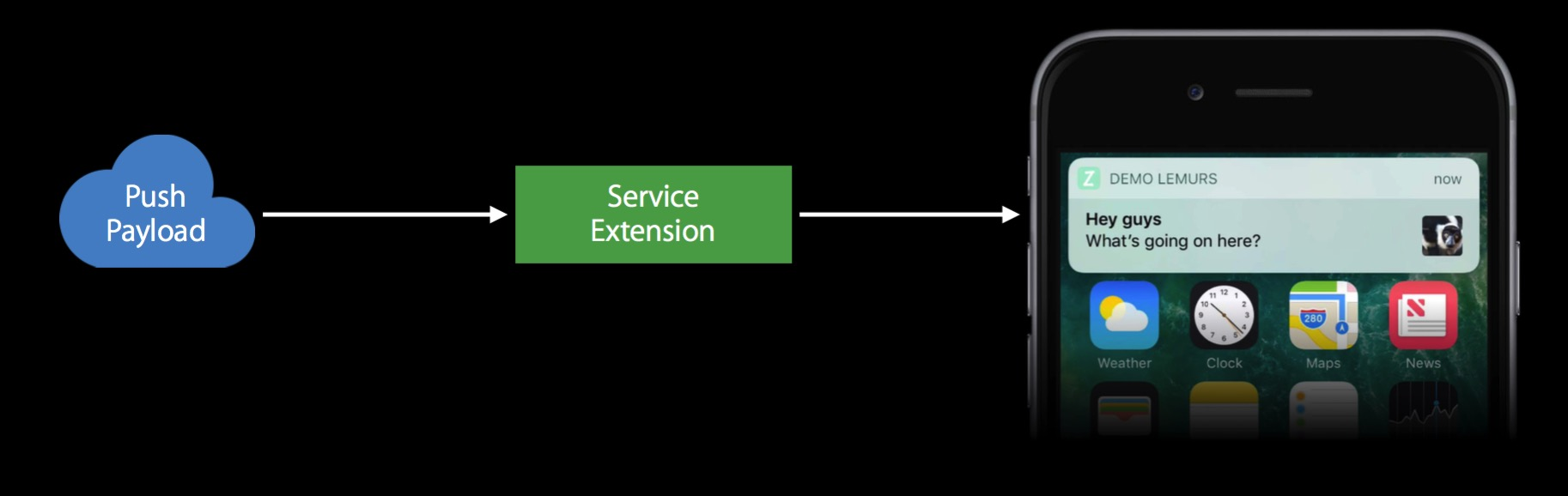 如果经常使用iMessage的朋友们,就会经常收到一些信息,附带了一些照片或者视频,所以推送中能附带这些多媒体是非常重要的。如果推送中包含了这些多媒体信息,可以使用户不用打开app,不用下载就可以快速浏览到内容。众所周知,推送通知中带了push payload,及时去年苹果已经把payload的size提升到了4k bites,但是这么小的容量也无法使用户能发送一张高清的图片,甚至把这张图的缩略图包含在推送通知里面,也不一定放的下去。在iOS X中,我们可以使用新特性来解决这个问题。我们可以通过新的service extensions来解决这个问题。
