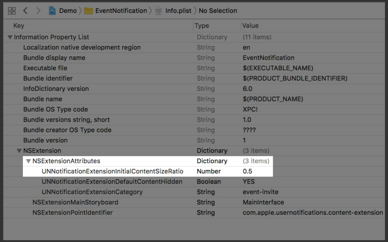 Notification content extension和我们注册notification actions一样,注册的相同的category。这个例子中,我们使用event-invite。值得提到的一点是,这里的extension是可以为一个数组的,里面可以为多个category,这样做的目的是多个category共用同一套UI。