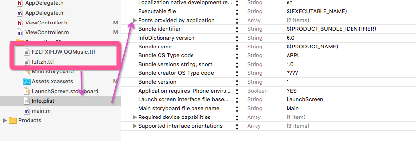 2、然后在info.plist中添加一个新的键Fonts provided by application, NSArray类型的, 在其对应的item里面的string值为**.TTF,如图: