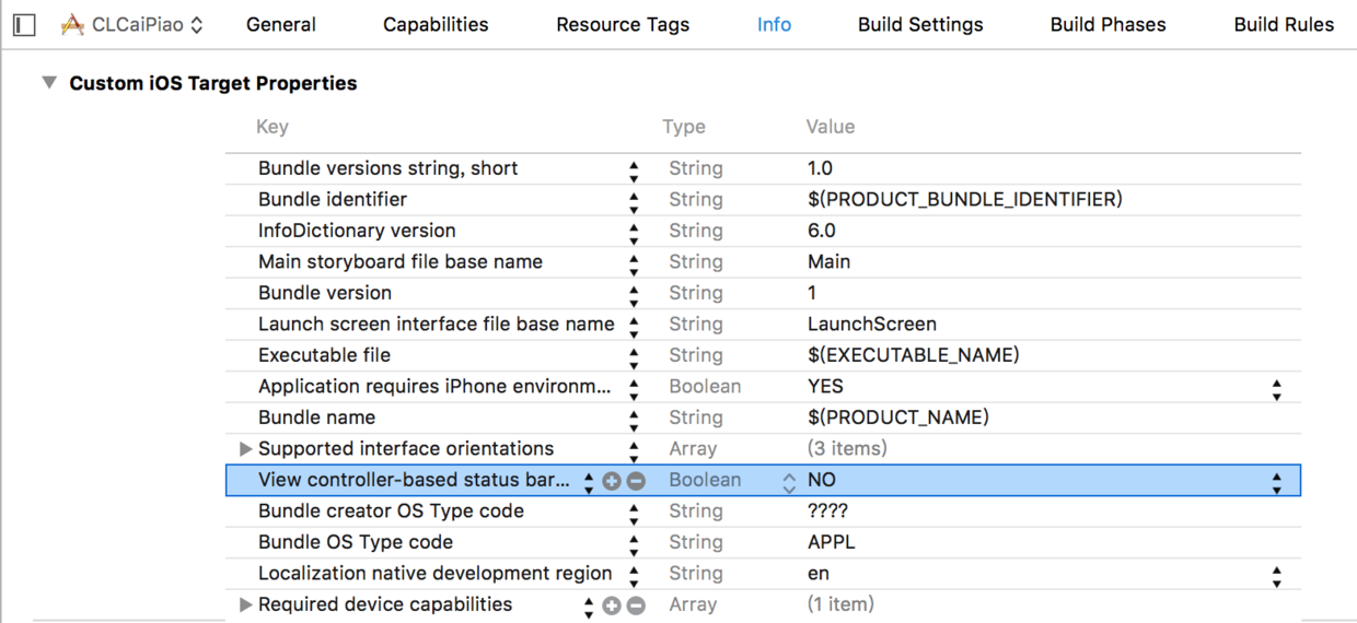 a.通过UIViewController管理(每一个UIViewController都可以拥有自己不同的状态栏)在iOS7中,默认情况下,状态栏都是由UIViewController管理的,UIViewController实现下列方法就可以轻松管理状态栏的可见性和样式状态栏的样式 - (UIStatusBarStyle)preferredStatusBarStyle;状态栏的可见性 -(BOOL)prefersStatusBarHidden;#pragma mark-设置状态栏的样式 -(UIStatusBarStyle)preferredStatusBarStyle { //设置为白色 //return UIStatusBarStyleLightContent; //默认为黑色 return UIStatusBarStyleDefault; } #pragma mark-设置状态栏是否隐藏(否) -(BOOL)prefersStatusBarHidden { return NO; }b.通过UIApplication管理(一个应用程序的状态栏都由它统一管理)如果想利用UIApplication来管理状态栏,首先得修改Info.plist的设置,添加选中行,并将NO改为YES,这篇文章中有详细介绍iOS中用application 来管理电池栏状态