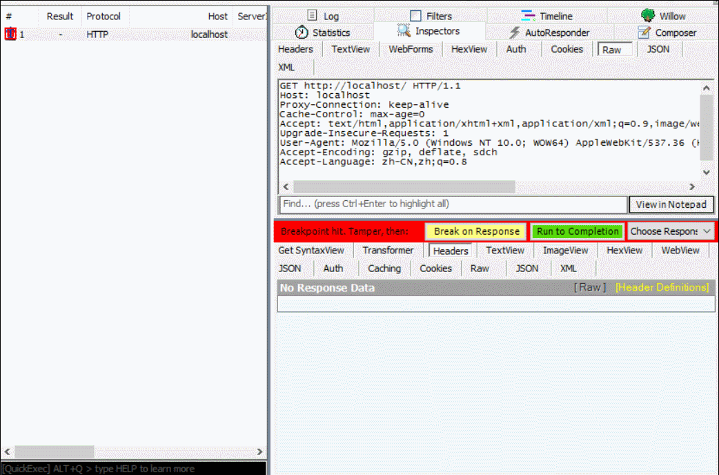 点击被拦截的请求,可以在右栏直接修改报文内容(上半区域是请求报文,下半区域是响应报文),点击黄色的“Break on Response”按钮可以执行下一步(把请求发给服务器),点击绿色的按钮“Run to Completion”可以直接完成整个请求过程: