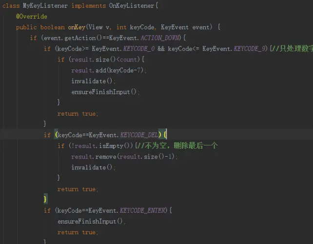 onCheckIsTextEditor()请重写这个方法并返回true,为了告诉系统,我这个view可以接受输入。好的,键盘是弹出来了,我们怎么监听用户输入呢?别急,不管是软键盘,还是“硬”键盘,用户的按键都是一个KeyEvent,我们直接设置个监听器,获得用户按下的键编号,就知道用户按下了什么了。this.setOnKeyListener(new MyKeyListener());