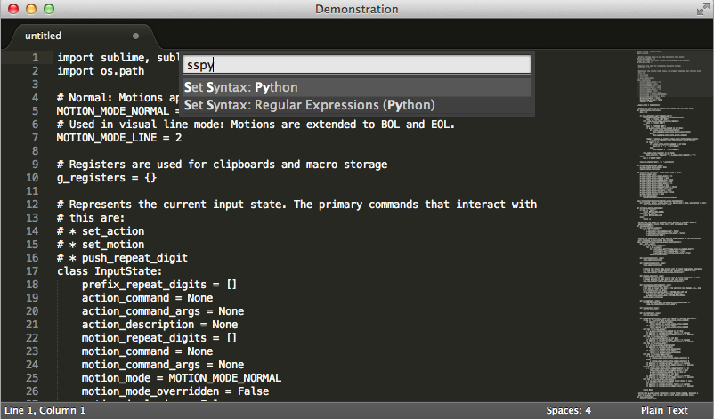 - 支持快捷命令 Cmd + Shift + P 即可打开快捷命令面板, 可以执行诸如设置语法高亮的命令: