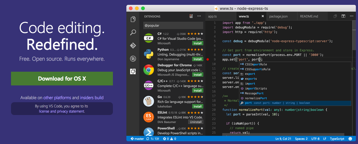 Visual Studio Code, 从名字就可以看出,它是微软出的一款纯文本编辑器。不只是与时俱进还是被逼无奈, 现在的微软已经完全不同于以前。 他们现在的产品更加符合互联网时代。 Visual Studio Code 是微软退出的一款完全免费的文本编辑器,他不只支持 Windows, 同样支持 Mac 和 Linux。