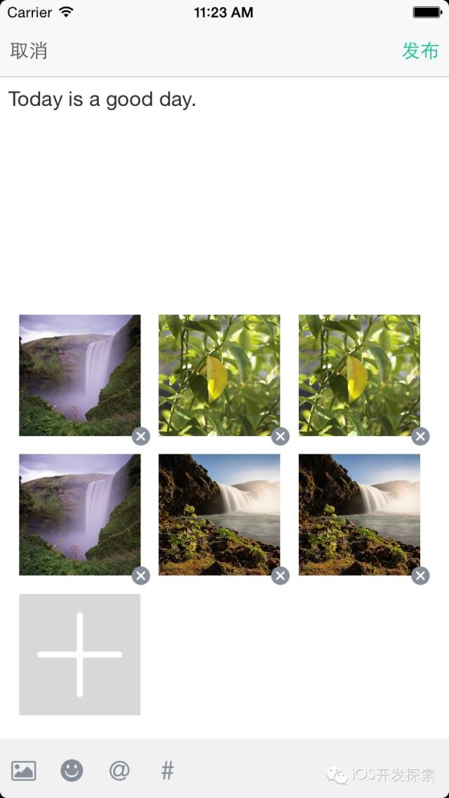 在很多UGC产品中(如微博、赤兔、朋友圈),发一条图文并茂的动态总是群众喜闻乐见的。如下图: