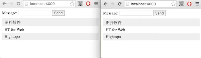 启动后,你在浏览器上输入 localhost:4000 就可以看到 Hello Message! 的字样。这是最简单的 HTTP 服务器,那么我们如何在上面加上 WebSocket 的功能呢呢?眼尖的同学可能已经发现上面的 package.json 的内容已经包含了 Socket.IO,那么 Socket.IO 要怎么用呢,怎么样才能达到实时数据通讯的效果呢?