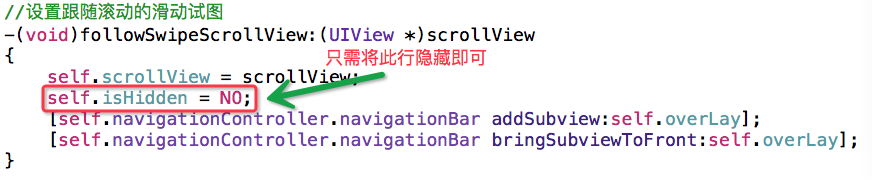 viewWillAppear中调用了,因为在跳转到下一级页面的时候NavBarViewController中的self.isHidden被设置成YES了,而这个在界面显示出来应为NO,所以需要在界面每次显示出来的时候将其设置成NO,所以要在viewWillAppear中调用,否则你在将tableview向上滑动navigationBar不消失,只有向下划一下,在向上滑动才会消失。您不妨试一试,也是一种学习。只需