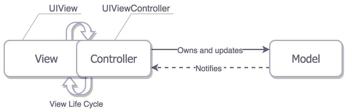 MVC中最大的问题在于C层负担了太多的业务,所以导致Controller过大。那么将一些不属于的Controller业务的逻辑分离到其他层中是主要的解决思路。iOS的MVC模式也被称作重控制器模式,这是在实际开发中,我们可以看到V和C难以相互独立,这两部分总是紧紧的粘合在一起的: