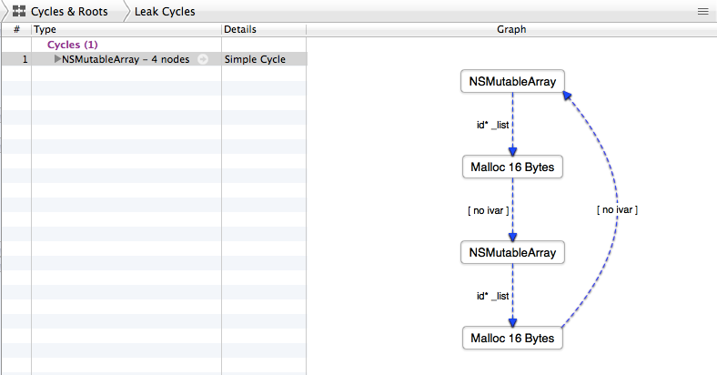 我们可以切换到 Leaks 这栏,点击”Cycles & Roots”,就可以看到以图形方式显示出来的循环引用。这样我们就可以非常方便地找到循环引用的对象了。