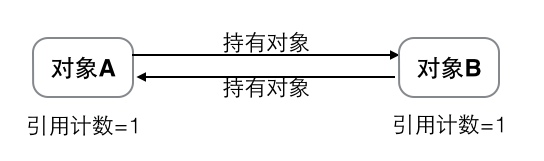 引用计数这种管理内存的方式虽然很简单,但是有一个比较大的瑕疵,即它不能很好的解决循环引用问题。如下图所示:对象 A 和对象 B,相互引用了对方作为自己的成员变量,只有当自己销毁时,才会将成员变量的引用计数减 1。因为对象 A 的销毁依赖于对象 B 销毁,而对象 B 的销毁与依赖于对象 A 的销毁,这样就造成了我们称之为循环引用(Reference Cycle)的问题,这两个对象即使在外界已经没有任何指针能够访问到它们了,它们也无法被释放。