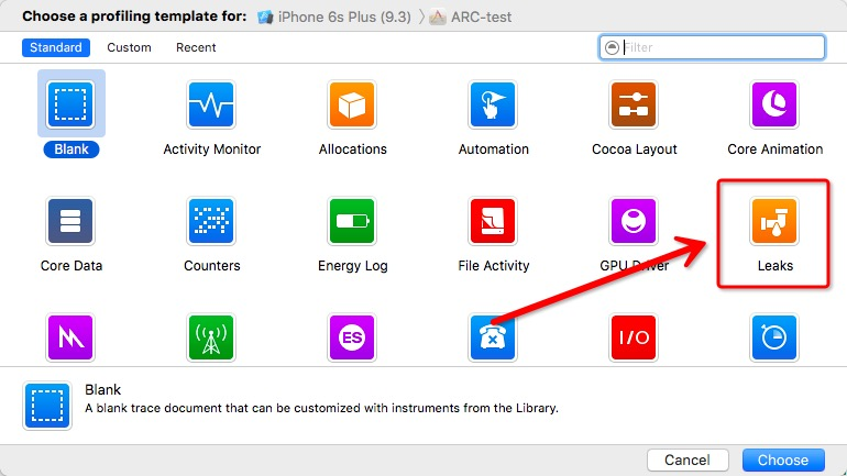 在 Xcode 的菜单栏选择:Product -> Profile,然后选择 “Leaks”,再点击右下角的”Profile” 按钮开始检测。如下图