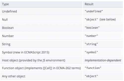 以下是我在MDN的文档中找到的一张包含typeof运算法的针对不同参数的输出结果的表格: