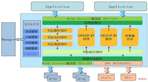 通过独立的中间件来统一管理所有数据源和数据分片整合,后端数据库集群对前端应用程序透明,需要独立部署和运维代理组件