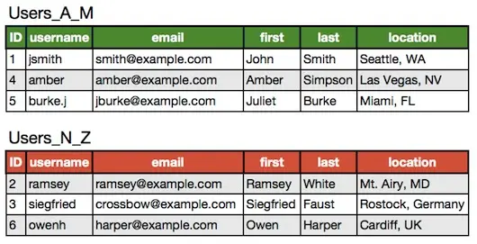 实际情况中往往会是垂直拆分和水平拆分的结合,即将Users_A_M和Users_N_Z再拆成Users和UserExtras,这样一共四张表