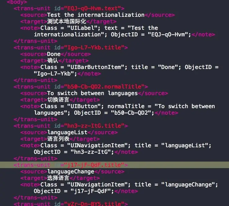 在两个xliff文件中分别翻译 两种不同的语言 中国语为例,翻译后如下