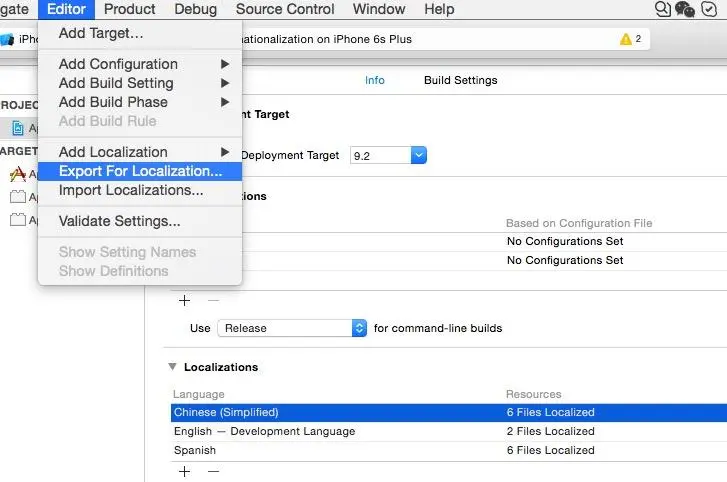 选择一个语种,点击Editor->Export For Localization.. 导出xliff翻译文件