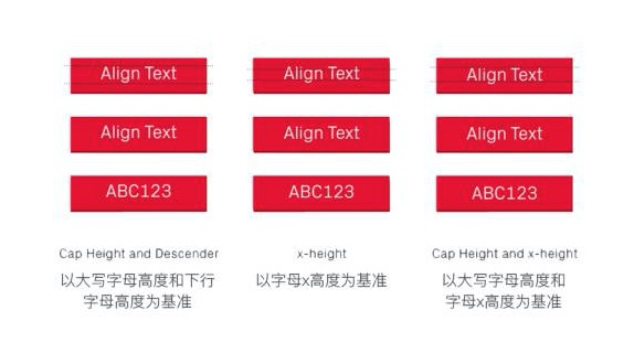 下面的是三个按钮文本对齐的例子。哪种最好,要看具体参数,比如说字体不同(以大写字母为参照的高度和以字母“x”为参照的高度,比例就不一样)、大小写、数字或者是三个都有。