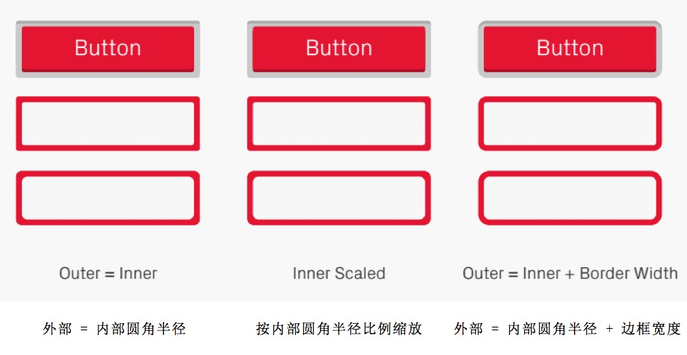 这有几个例子,最常用的就是:内外部圆角半径一样,按内部圆角半径的比例缩放,或者是把边框宽度和内部圆角半径相加。