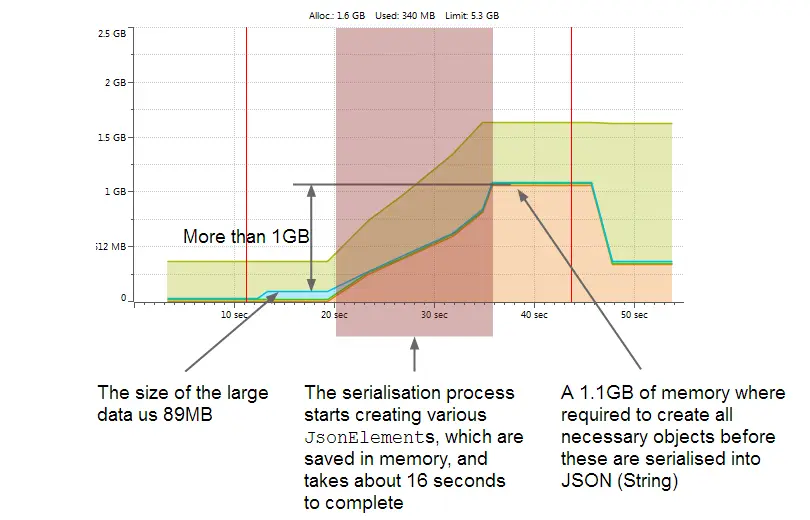 上面的的LargeData在这里会消耗89MB的内存,从java对象转化为JSON字符串的过程将会消耗大概16s的时间并且需要超过1GB的内存。也就是说,序列化1MB的数据我们需要大约11MB的工作空间。1:11的确实是一个不小的比列。下面的 图片会展示整个过程的几个阶段。