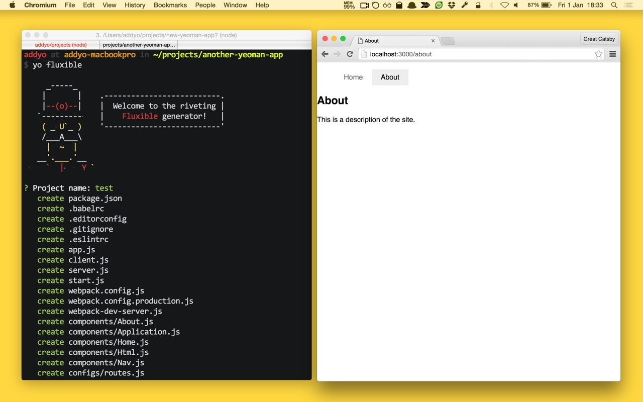 I tested local-npm with Yeoman and Yahoo's generator-fluxible, which only uses npm for package management. As you can see below, everything including dependency installation worked fine and I was able to preview the output from a cached install without issues: