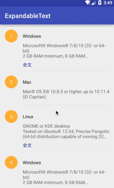 所以当获取完每个position上的item文本行数后应把信息存起来,在这里我们定义三种状态并在每个item初始化时保存起来:STATE_NOT_OVERFLOW //文本不超过规定行数STATE_COLLAPSED //文本超过了规定行数,处于折叠状态STATE_EXPANDED //文本超过了规定行数,被点击后处于展开状态