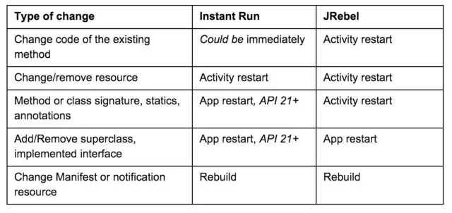 笔者在React开发中使用HOT Reload是个很不错的体验,而在Android开发中,即使是一个很小的Android项目,也需要等待不少的时间来等待修改之后的代码重新构建与部署,更何况对于那些有成百上千个类与XML布局文件的项目。另一方面,你也需要在你的应用中跳转选择到合适的页面来查看你做的更改的实际效果。2015年底,Android社区逐步使用两个工具来加速代码更改的加载速度,首先是JRebel,源于Java在服务端开发中的长期实践。另一个是Google团队随着Android Studio 2.0一起推出的工具:Instant Run。两个工具的目标差不多,不过JRebel包含更多的特性,但是它也需要付费。作者编辑了一个简单的表单来描述二者的特性对比: