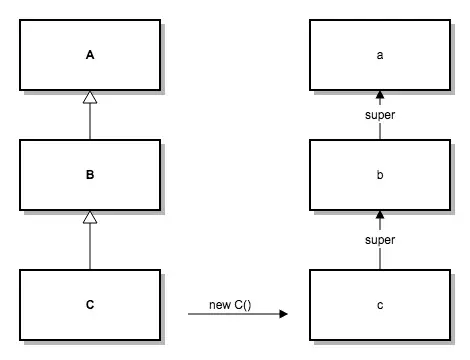 创建C的实例c,并将实例c的super指针指向b。