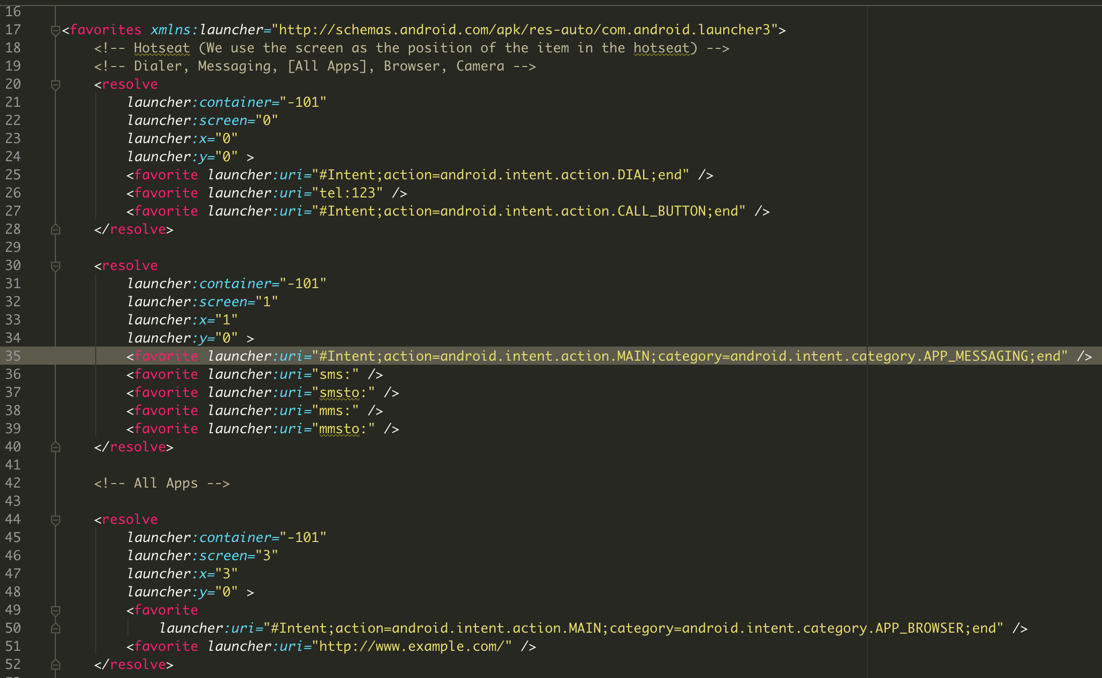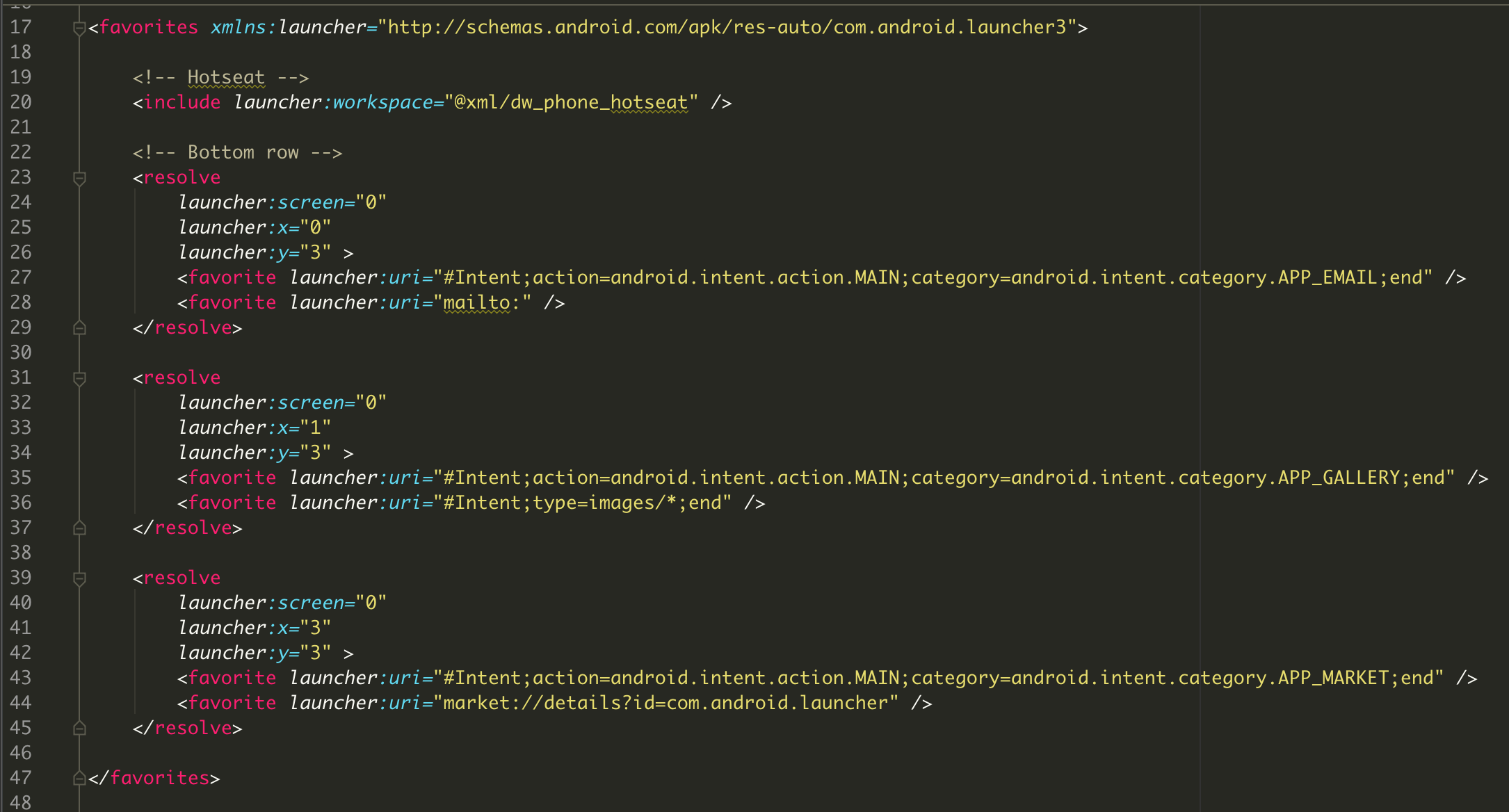 先看上半部分,就是我们说的4x4部分,每一格表示一个图标,在我们绘制图标的时候已经分好了格,每格的大小,只要知道知道他的位置即可绘制图标到相应的位置,那么代码中的x,y就是这个图标的位置.上面resolve中还有两个favorite,在第一个中最后面有个”APP_”,这个我们一看就知道是应用的属性,其实这就表示我们配置了那个app在这个位置,我们再看一下上面介绍的hotseat那个xml文件: