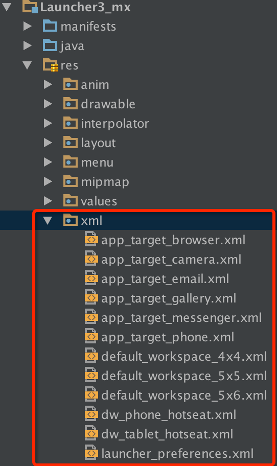 下面是Launcher的资源文件,我们看这个比我们平时的多一个xml文件夹,里面有很多xml文件,那么这些是做什么用的,我来解释一下,有三个文件,分别为default_workspace_4x4.xml,default_workspace_5x5.xml和default_workspace_5x6.xml,这三个文件就是我们默认的布局文件,后面的跟着的4x4、5x5和5x6表示桌面图标的列数和行数,也就是4行4列,5行5列,5行6列,这个怎么用我们后面再说.