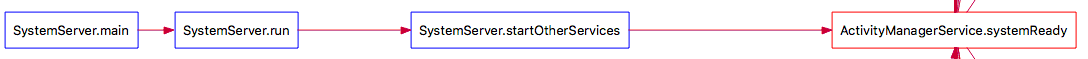 从上面的调用图可知有三个地方调用了启动Launcher的方法,这三个方法中首次启动应该是中间的那个systemReady方法,系统准备过程中调用启动Launcher,我们看一下systemReady方法是哪里调用的来验证一下:
