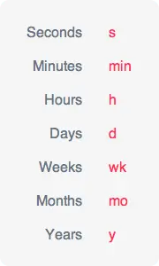 使用那些用户能够识别出的标准化的缩写词。对于复数形式,不要在缩写词之后使用“s”,跟单数形式一样使用就行了。上图中是每个时间单位的标准缩写词。