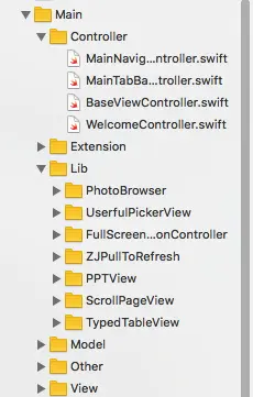 class BaseViewController: UIViewController { /// 用于RxSwift var disposeBag = DisposeBag() /// 标记是否更新了布局 private var didUpdateConstraints = false override func viewDidLoad() { super.viewDidLoad() view.backgroundColor = UIColor.whiteColor() } /// 重写方法 override func updateViewConstraints() { if !didUpdateConstraints { addConstraints() didUpdateConstraints = true } super.updateViewConstraints() } /// 子类重写, 用于添加自动布局 func addConstraints() { /// default do nothing } } - lib文件夹下主要是使用的一些封装好的东西, 不过在这个项目中, lib里面的全是用的我自己写的一些东西, 一些之前已经放在了github上了, 这里简单介绍一下, 给自己一个广告😄