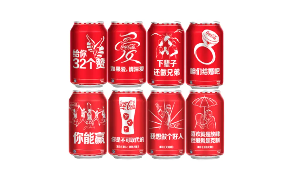 先说真实世界的这个经典例子,可口可乐在2015年的时候做的“台词瓶”,即在原本经典的红色易拉罐外,又设计了8款可以拉动人们之间认同感的Slogan,比如说“给你32个赞”,“下辈子还做兄弟”,可口可乐通过这个设计,增加了用户对自我和品牌的认同感,同时也符合年轻人群体的社会认同感。通过这个设计,当年可口可乐的销量因为得到了非常高的提升。