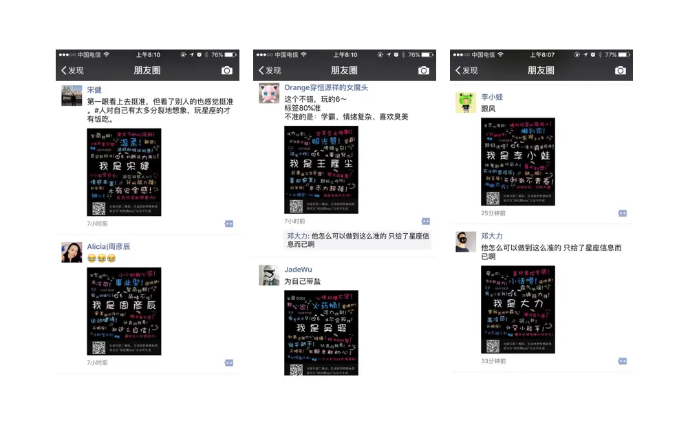 其实当天我打开朋友圈时,并不知道发生了什么,但是我下意识一定会去识别这个二维码。你最开始不会认真去判断这个东西是否能很准的反映出你自己,我觉得是大家看到一堆人在晒,就会被影响,然后会跟风地去使用,然后发现我自己晒出来也不错,最后自然地加入了传播大军。