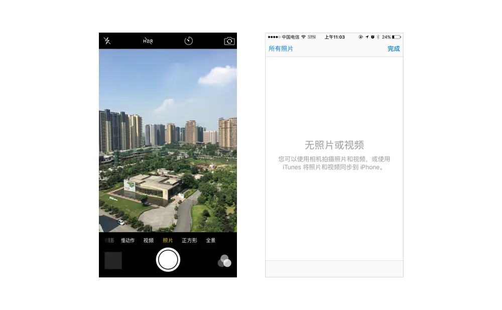 但iOS考虑到了这种场景,在锁屏态启用相机时,他将左侧的缩略图做了一个隐藏,不让其他用户看到相册里的照片,并且当点击缩略进入全部相册后,也看不到里面的任何照片。