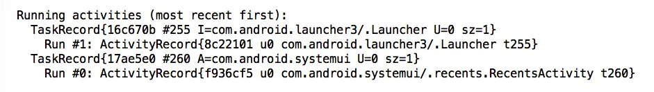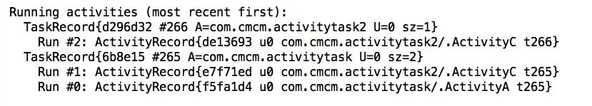 现在我们启动MainActivity,后再启动ActivityA,然后我们通过 adb shell dumpsys activity activities 命令查看此时栈的情况: