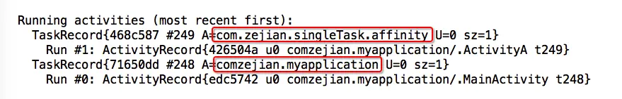 我们可以清楚地看到两个任务栈,其中一个是id=249,栈名称为com.zejian.singleTask.affinity的任务栈,该栈包含了ActivityA,另外一个则是id=248,栈名为默认包名的任务栈,包含了MainActivity。到此我们也明白了,我们确实可以通过singleTask与android:taskAffinity属性相结合的方式来指定我们Activity所需要的栈名称,使相应的Activity存在于不同的栈中,图解如下: